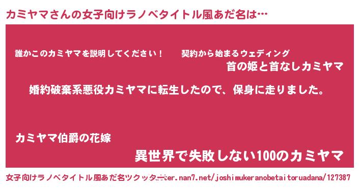 | 男性向けラノベタイトル風あだ名 | 『転生したらカミヤマだった件』 |