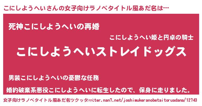 | 男性向けラノベタイトル風あだ名 | 『Re:こにしようへいから始める異世界生活』 |