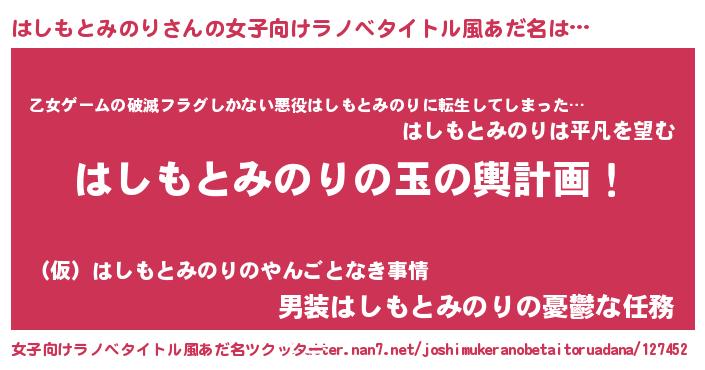 | 男性向けラノベタイトル風あだ名 | 『はしもとみのり~年齢イコール彼女いない歴の魔法使い~』 |