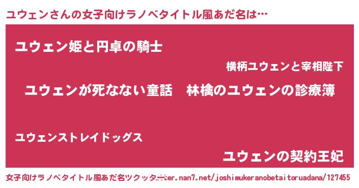 | 男性向けラノベタイトル風あだ名 | 『魔弾の王とユウェン』『ユウェンの憂鬱』 |