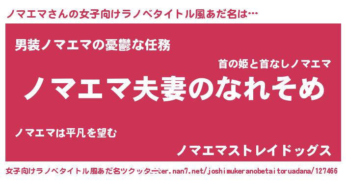 | 男性向けラノベタイトル風あだ名 | 『おまえをオタクにしてやるから、俺をノマエマにしてくれ! 』 |