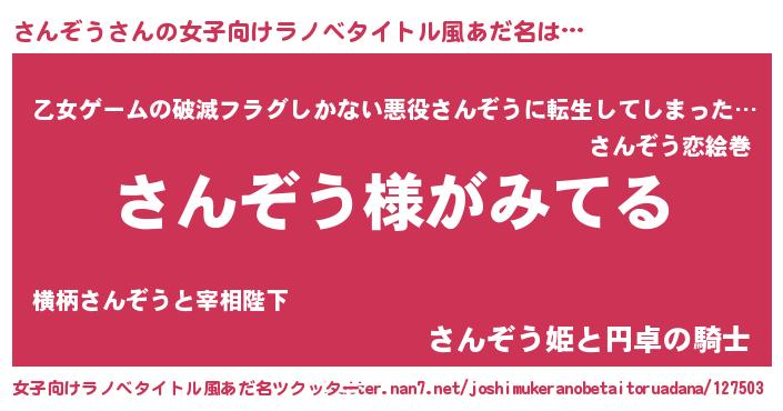 | 男性向けラノベタイトル風あだ名 | 『さんぞうの嫁は女の子じゃないと思った?』 |