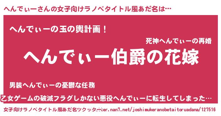 | 男性向けラノベタイトル風あだ名 | 『うちの娘の為ならば、俺はもしかしたらへんでぃーも倒せるかもしれない。』 |