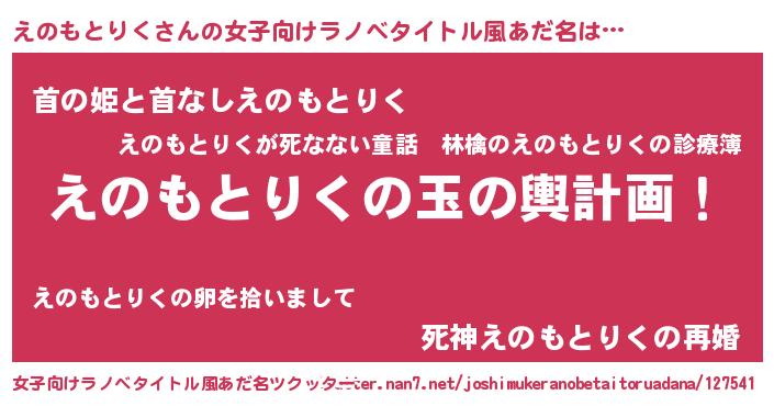 | 男性向けラノベタイトル風あだ名 | 『転生したらえのもとりくだった件』 |