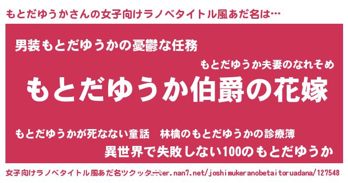 もとだゆうかさんの女子向けラノベタイトル風あだ名は… 『もとだゆうか伯爵の花嫁』『男装もとだゆうかの憂鬱な任務』『異世界で失敗しない100のもとだゆうか』 ツクッター #女子向けラノベタイトル風あだ名ツクッター http://tkutter.nan7.net/joshimukeranobetaitoruadana/127548/