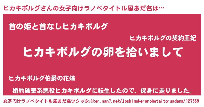 | 男性向けラノベタイトル風あだ名 | 『ヒカキボルグの嫁は女の子じゃないと思った?』 |
