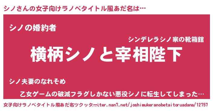 | 男性向けラノベタイトル風あだ名 | 『シノに滅ぼされるだけの簡単なお仕事です』 |