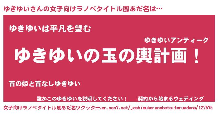 ゆきゆいさんの女子向けラノベタイトル風あだ名は… 『ゆきゆいの玉の輿計画!』『ゆきゆいは平凡を望む』『誰かこのゆきゆいを説明してください! ~契約から始まるウェディング~』 ツクッター #女子向けラノベタイトル風あだ名ツクッター http://tkutter.nan7.net/joshimukeranobetaitoruadana/127575/