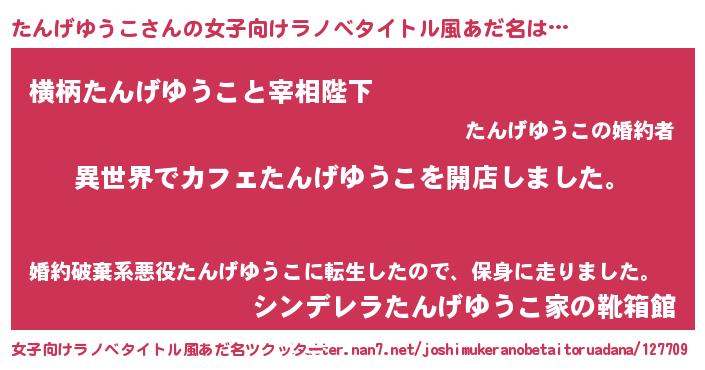 たんげゆうこさんの女子向けラノベタイトル風あだ名は… 『異世界でカフェたんげゆうこを開店しました。』『横柄たんげゆうこと宰相陛下』『シンデレラたんげゆうこ家の靴箱館』 ツクッター #女子向けラノベタイトル風あだ名ツクッター http://tkutter.nan7.net/joshimukeranobetaitoruadana/127709/
