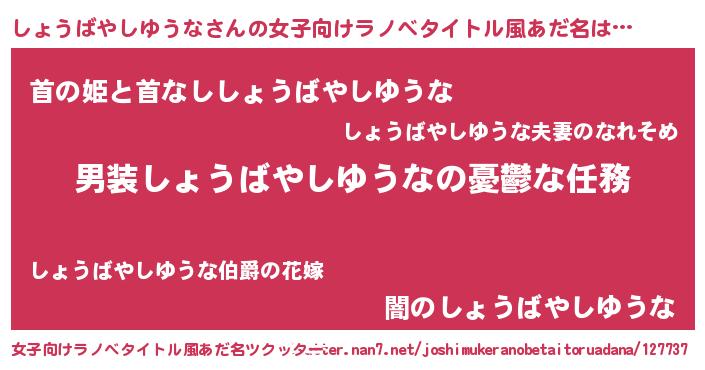 | 男性向けラノベタイトル風あだ名 | 『うちのしょうばやしゆうなが世界を掌握している!』 |