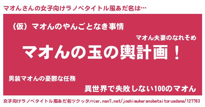マオんさんの女子向けラノベタイトル風あだ名は… 『マオんの玉の輿計画!』『(仮)マオんのやんごとなき事情』『異世界で失敗しない100のマオん』 ツクッター #女子向けラノベタイトル風あだ名ツクッター http://tkutter.nan7.net/joshimukeranobetaitoruadana/127763/