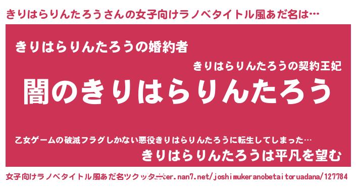 | 男性向けラノベタイトル風あだ名 | 『Re:きりはらりんたろうから始める異世界生活』 |