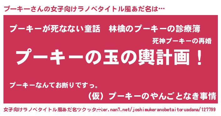 | 意味不明あだ名 | 『なめこ科プーキー属』『自称プーキー』 |