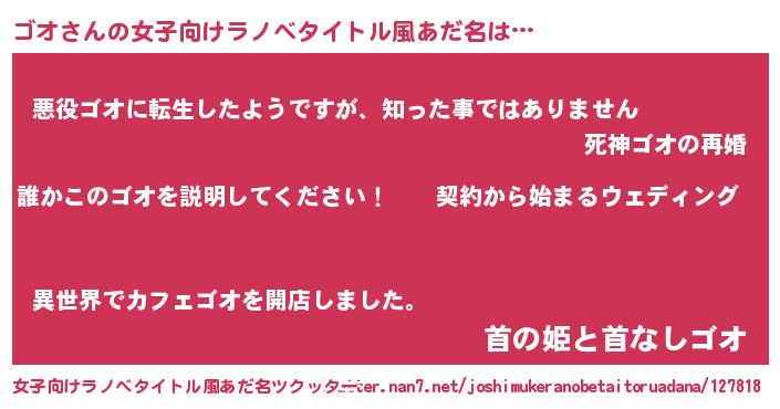 ゴオさんの女子向けラノベタイトル風あだ名は… 『誰かこのゴオを説明してください! ~契約から始まるウェディング~』『悪役ゴオに転生したようですが、知った事ではありません』『首の姫と首なしゴオ』 ツクッター #女子向けラノベタイトル風あだ名ツクッター http://tkutter.nan7.net/joshimukeranobetaitoruadana/127818/