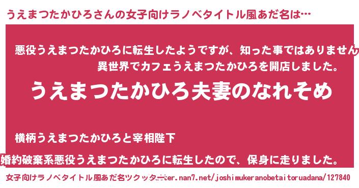 | 男性向けラノベタイトル風あだ名 | 『おまえをオタクにしてやるから、俺をうえまつたかひろにしてくれ! 』 |