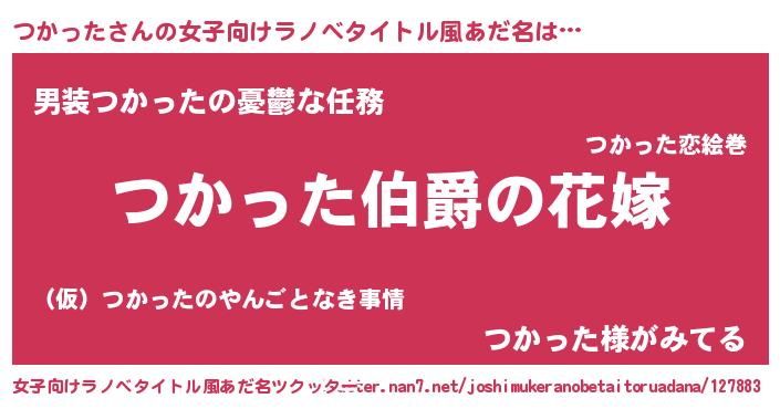 | 男性向けラノベタイトル風あだ名 | 『うちの娘の為ならば、俺はもしかしたらつかったも倒せるかもしれない。』 |
