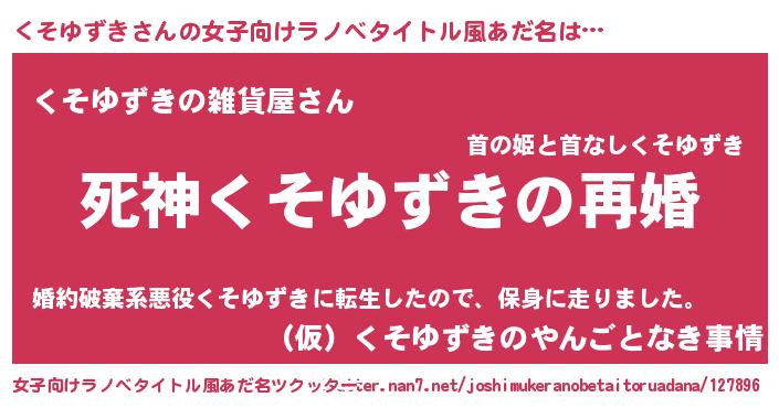 くそゆずきさんの女子向けラノベタイトル風あだ名は… 『死神くそゆずきの再婚』『くそゆずきの雑貨屋さん』『(仮)くそゆずきのやんごとなき事情』 ツクッター #女子向けラノベタイトル風あだ名ツクッター http://tkutter.nan7.net/joshimukeranobetaitoruadana/127896/