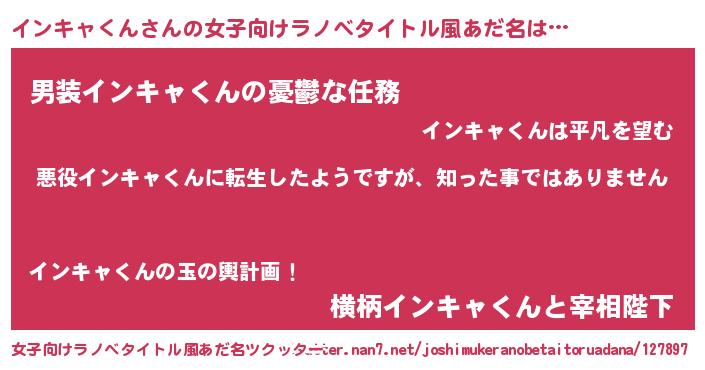 | 男性向けラノベタイトル風あだ名 | 『この素晴らしい世界にインキャくんを!』 |