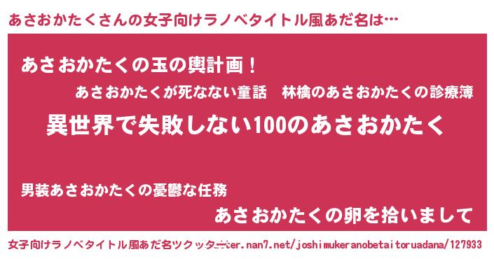 | 男性向けラノベタイトル風あだ名 | 『あさおかたくという概念が存在しない退屈な世界 』 |