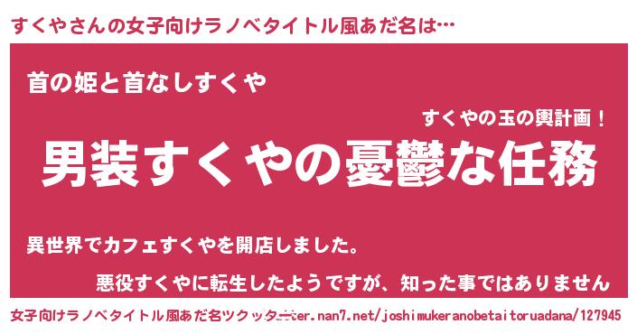| 男性向けラノベタイトル風あだ名 | 『うちのすくやが世界を掌握している!』 |