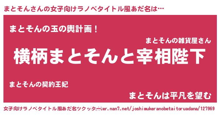 まとそんさんの女子向けラノベタイトル風あだ名は… 『横柄まとそんと宰相陛下』『まとそんの玉の輿計画!』『まとそんは平凡を望む』 ツクッター #女子向けラノベタイトル風あだ名ツクッター http://tkutter.nan7.net/joshimukeranobetaitoruadana/127969/