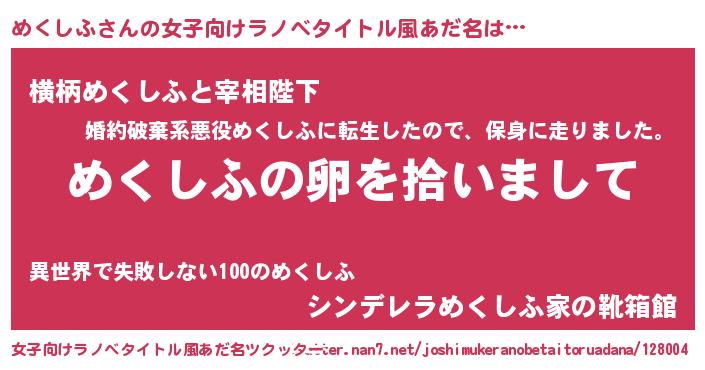 | 男性向けラノベタイトル風あだ名 | 『めくしふの嫁は女の子じゃないと思った?』 |