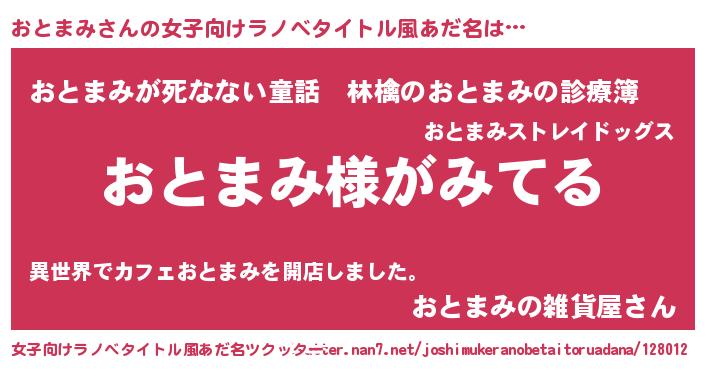 | 男性向けラノベタイトル風あだ名 | 『おとまみの嫁は女の子じゃないと思った?』 |