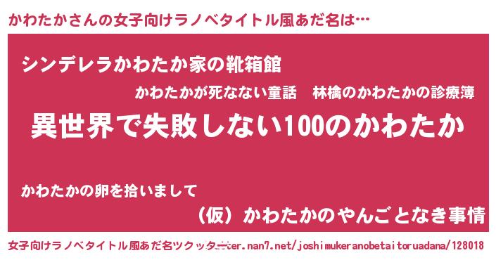| 男性向けラノベタイトル風あだ名 | 『かわたかという概念が存在しない退屈な世界 』 |
