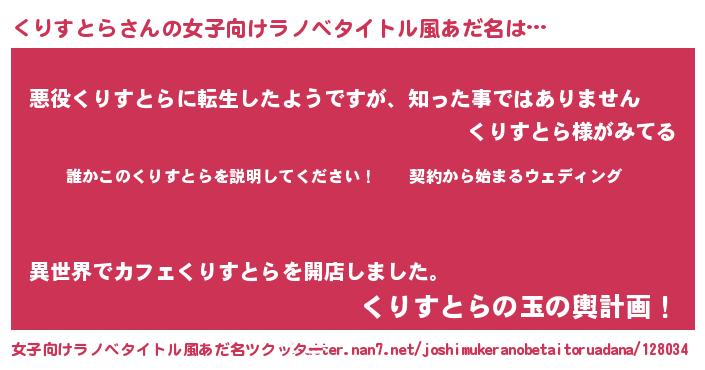くりすとらさんの女子向けラノベタイトル風あだ名は… 『誰かこのくりすとらを説明してください! ~契約から始まるウェディング~』『悪役くりすとらに転生したようですが、知った事ではありません』『くりすとらの玉の輿計画!』 ツクッター #女子向けラノベタイトル風あだ名ツクッター http://tkutter.nan7.net/joshimukeranobetaitoruadana/128034/