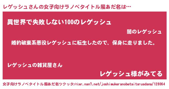 | 男性向けラノベタイトル風あだ名 | 『レゲッシュスレイヤー』 |