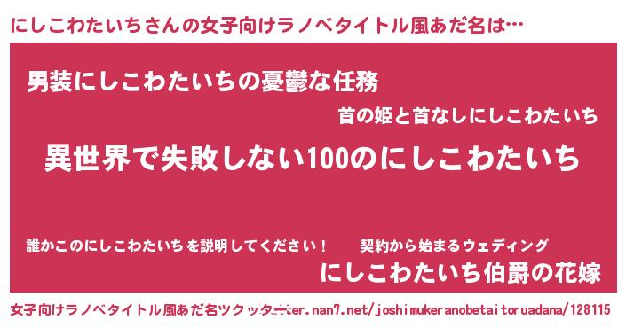 | 男性向けラノベタイトル風あだ名 | 『にしこわたいちという概念が存在しない退屈な世界 』 |