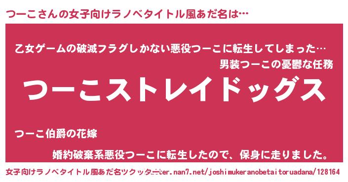 | 男性向けラノベタイトル風あだ名 | 『Re:つーこから始める異世界生活』 |