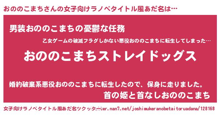 | 男性向けラノベタイトル風あだ名 | 『Re:おののこまちから始める異世界生活』 |