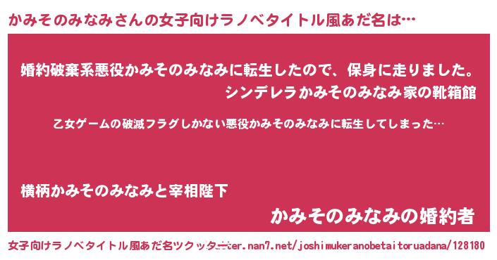 | 男性向けラノベタイトル風あだ名 | 『この素晴らしい世界にかみそのみなみを!』 |