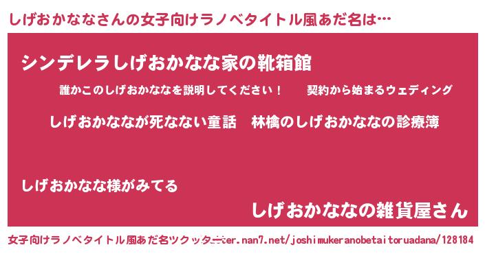 | 男性向けラノベタイトル風あだ名 | 『魔弾の王としげおかなな』 |