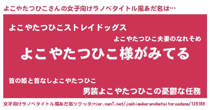 | 男性向けラノベタイトル風あだ名 | 『よこやたつひこの嫁は女の子じゃないと思った?』 |