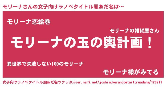 | 男性向けラノベタイトル風あだ名 | 『モリーナ~年齢イコール彼女いない歴の魔法使い~』 |