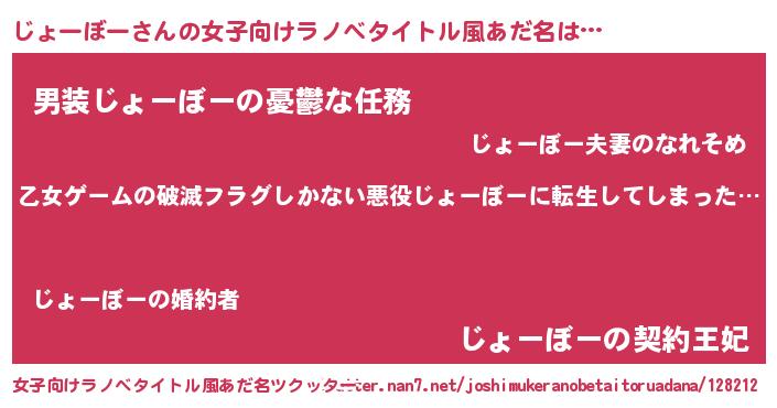 | 男性向けラノベタイトル風あだ名 | 『この素晴らしい世界にじょーぼーを!』 |