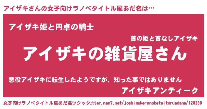 | 男性向けラノベタイトル風あだ名 | 『やはりアイザキの青春ラブコメはまちがっている 』 |