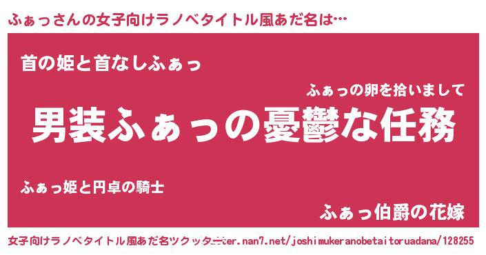 ふぁっさんの女子向けラノベタイトル風あだ名は… 『男装ふぁっの憂鬱な任務』『首の姫と首なしふぁっ』『ふぁっ伯爵の花嫁』 ツクッター #女子向けラノベタイトル風あだ名ツクッター http://tkutter.nan7.net/joshimukeranobetaitoruadana/128255/
