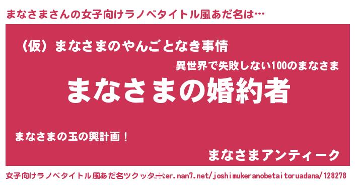 | 男性向けラノベタイトル風あだ名 | 『うちの娘の為ならば、俺はもしかしたらまなさまも倒せるかもしれない。』 |