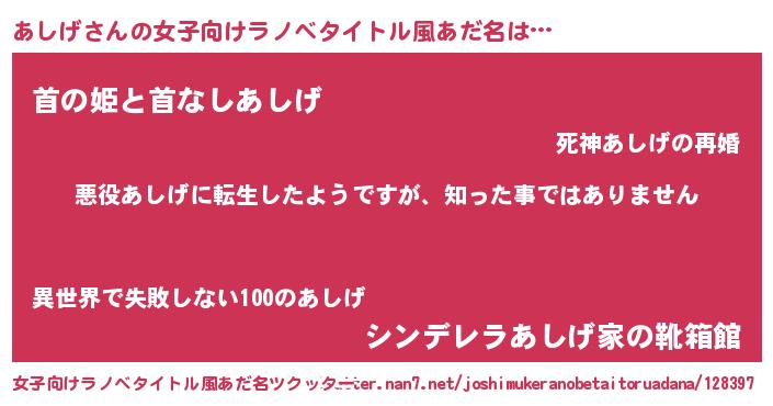 | 男性向けラノベタイトル風あだ名 | 『この素晴らしい世界にあしげを!』 |