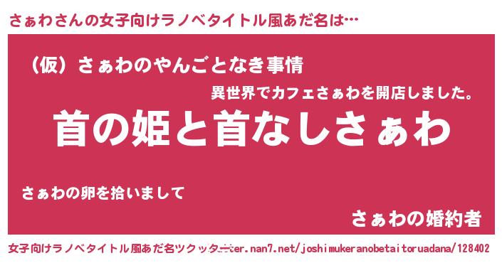 | 男性向けラノベタイトル風あだ名 | 『はたらくさぁわさま!』『さぁわの憂鬱』 |