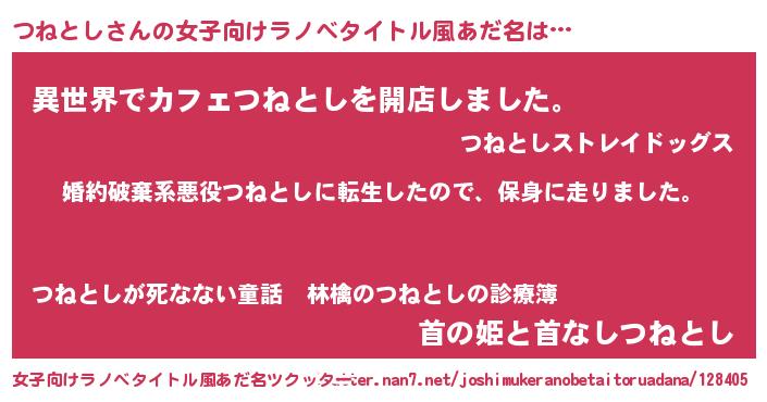 | 男性向けラノベタイトル風あだ名 | 『ツネトシスレイヤー』 |