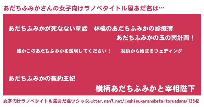 あだちふみかさんの女子向けラノベタイトル風あだ名は… 『誰かこのあだちふみかを説明してください! ~契約から始まるウェディング~』『あだちふみかが死なない童話 林檎のあだちふみかの診療簿』『横柄あだちふみかと宰相陛下』 ツクッター #女子向けラノベタイトル風あだ名ツクッター http://tkutter.nan7.net/joshimukeranobetaitoruadana/12842/