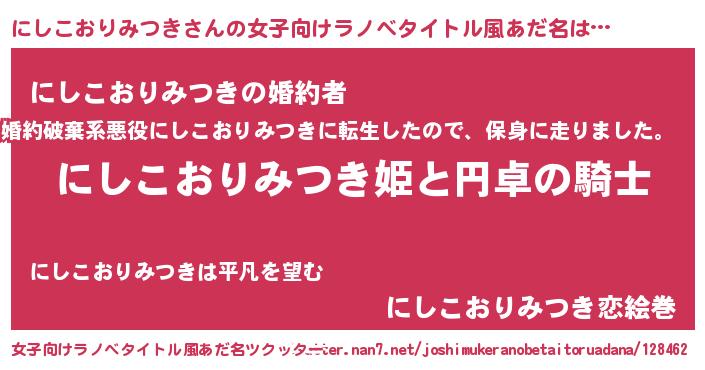 | 男性向けラノベタイトル風あだ名 | 『ニシコオリミツキアートオンライン』 |