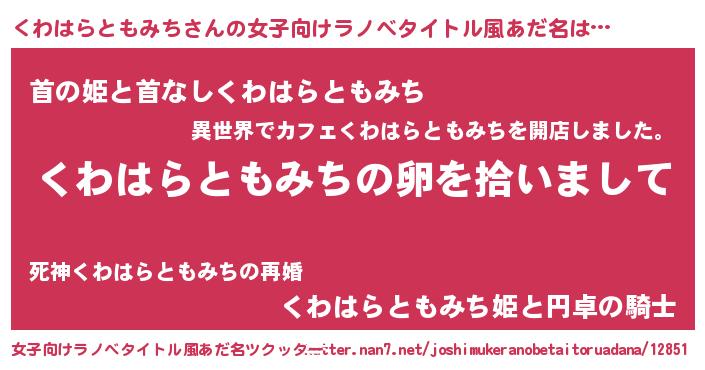 | 男性向けラノベタイトル風あだ名 | 『くわはらともみちの嫁は女の子じゃないと思った?』 |