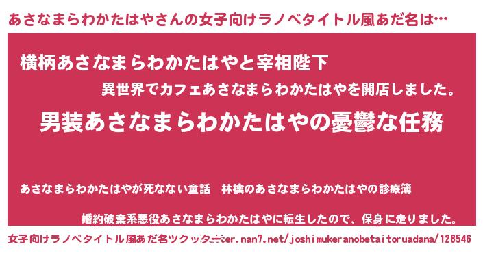 | 男性向けラノベタイトル風あだ名 | 『うちのあさなまらわかたはやが世界を掌握している!』 |