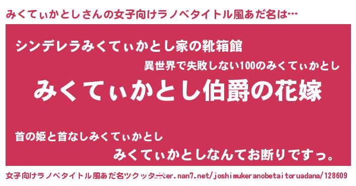 | 男性向けラノベタイトル風あだ名 | 『やはりみくてぃかとしの青春ラブコメはまちがっている 』 |