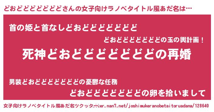 どおどどどどどどどさんの女子向けラノベタイトル風あだ名は… 『死神どおどどどどどどどの再婚』『首の姫と首なしどおどどどどどどど』『どおどどどどどどどの卵を拾いまして』 ツクッター #女子向けラノベタイトル風あだ名ツクッター http://tkutter.nan7.net/joshimukeranobetaitoruadana/128640/